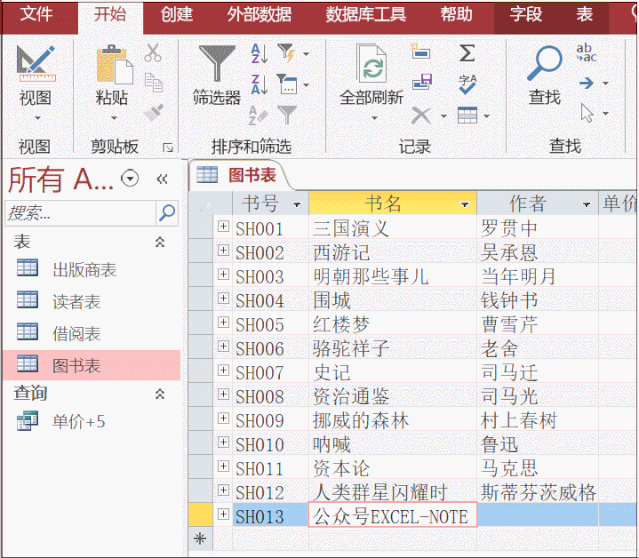 下面创建查询设计,选择图书表的书名、作者和单价字段。在作者字段下设置该条件,运行查询,保存结果。