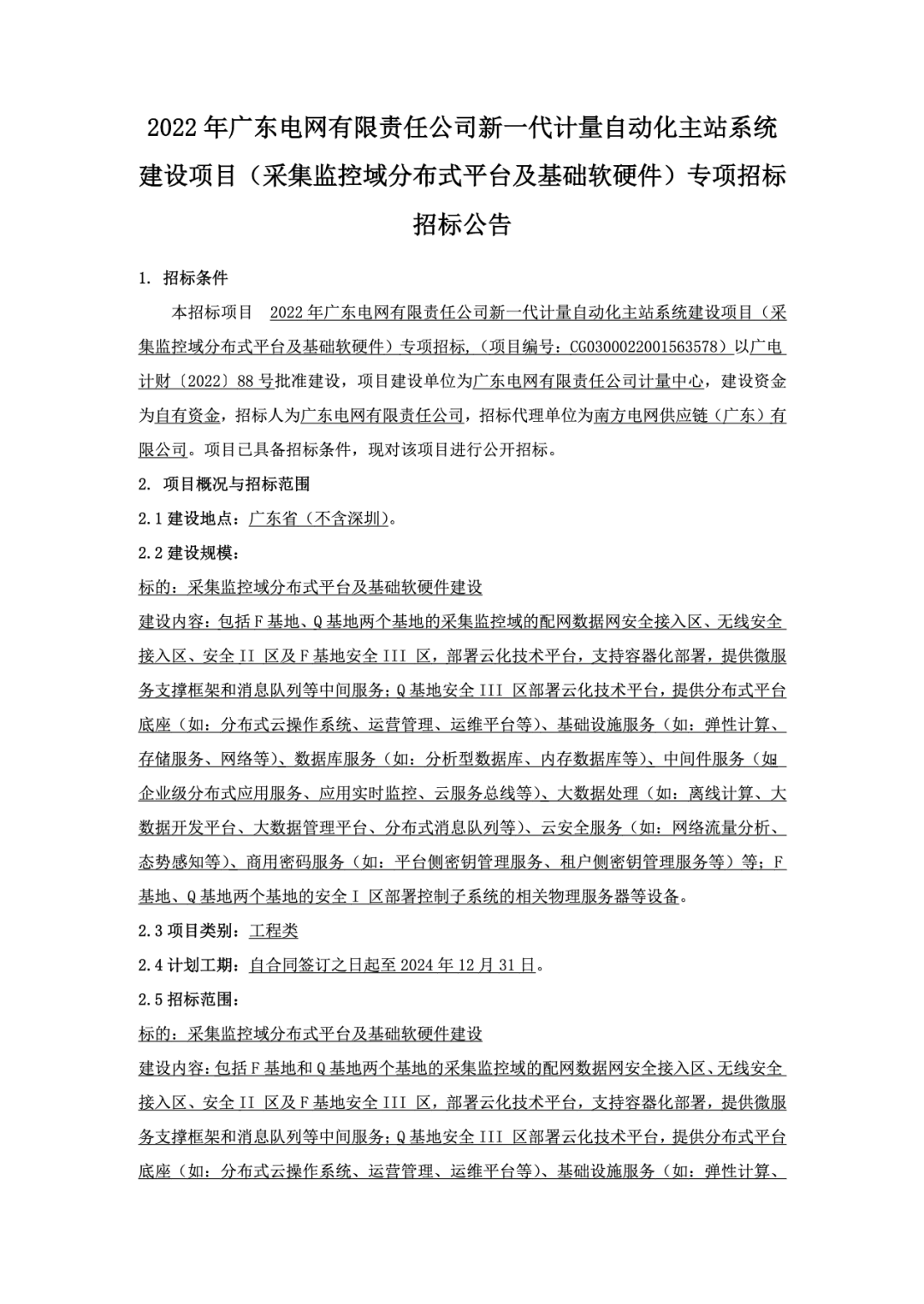 本招标项目 2022年广东电网有限责任公司新一代计量自动化主站系统建设项目(采集监控域分布式平台及基础软硬件)专项招标,(项目编号:CG0300022001563578)以广电计财〔2022〕88号批准建设,项目建设单位为广东电网有限责任公司计量中心,建设资金为自有资金,招标人为广东电网有限责任公司,招标代理单位为南方电网供应链(广东)有限公司。项目已具备招标条件,现对该项目进行公开招标。