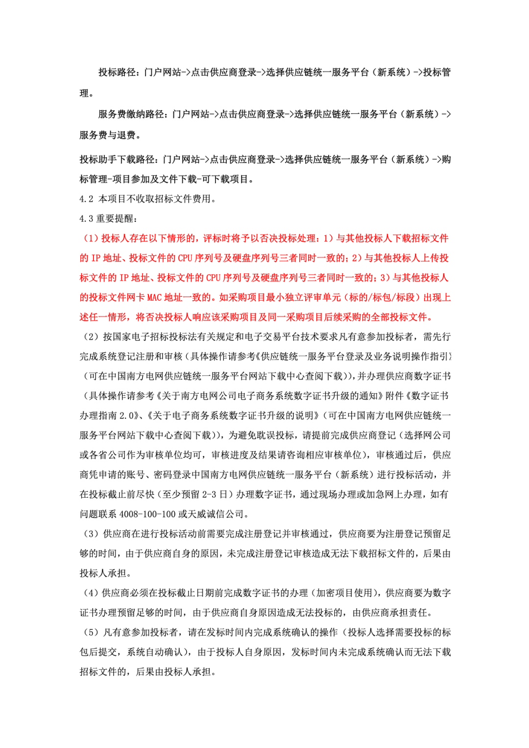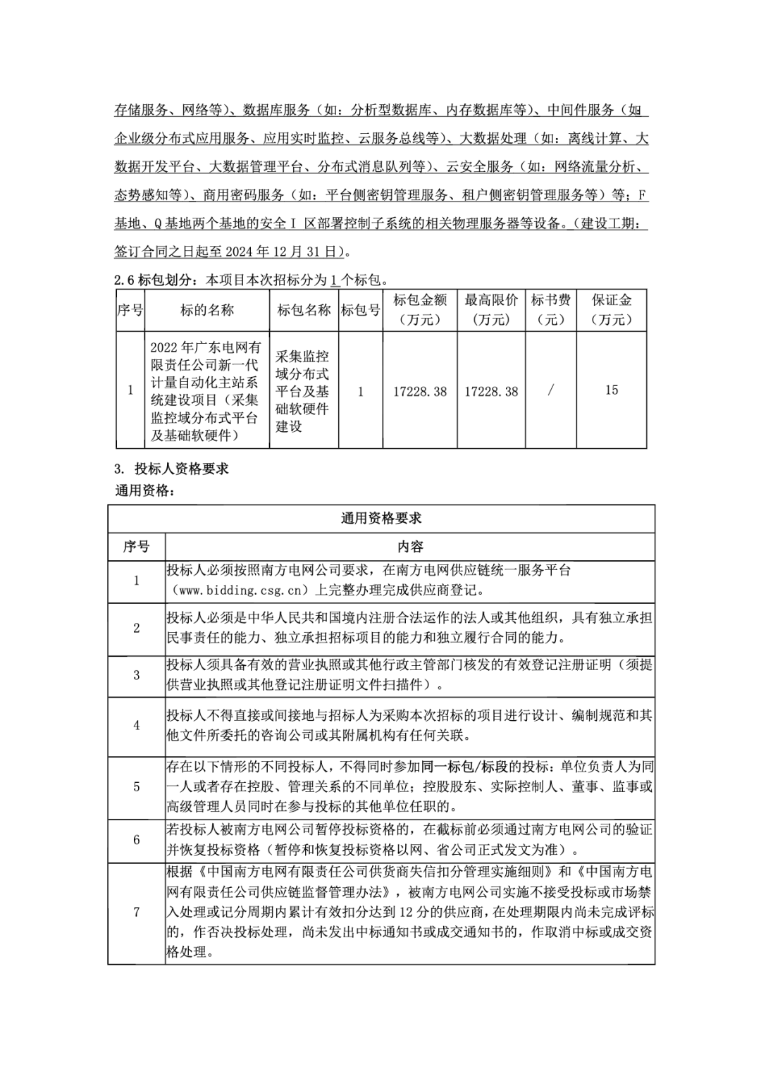 6 | 若投标人被南方电网公司暂停投标资格的,在截标前必须通过南方电网公司的验证并恢复投标资格(暂停和恢复投标资格以网、省公司正式发文为准)。 |