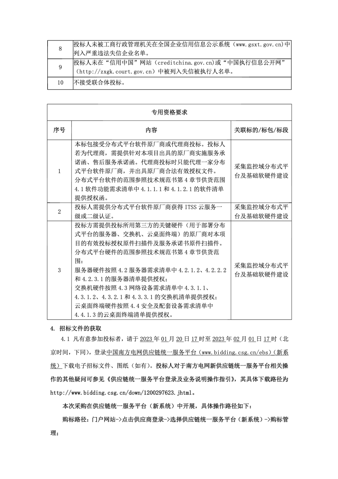 4.1 凡有意参加投标者,请于2023年01月20日17时至2023年02月01日17时(北京时间,下同),登录中国南方电网供应链统一服务平台(www.bidding.csg.cn/ebs)(新系统)下载电子招标文件、图纸(如有)。投标人对于南方电网新供应链统一服务平台相关操作的其他疑问可参见 《供应链统一服务平台登录及业务说明操作指引》,其具体下载路径为:http://www.bidding.csg.cn/down/1200297623.jhtml。