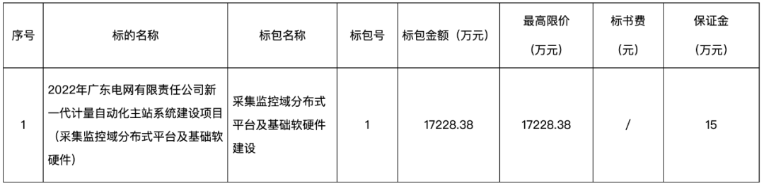 1 | 2022年广东电网有限责任公司新一代计量自动化主站系统建设项目(采集监控域分布式平台及基础软硬件) | 采集监控域分布式平台及基础软硬件建设 | 1 | 17228.38 | 17228.38 | / | 15 |