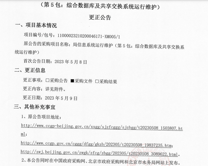 首次公告日期:2023-05-08 14:59 地址:http://www.ccgp-beijing.gov.cn/xxgg/sjzfcggg/sjzbgg/t20230508_1503807.html; http://www.ccgp.gov.cn/cggg/dfgg/gkzb/202305/t20230508_19837235.htm; http://swj.beijing.gov.cn/zwgk/zfcg/zbgg/202305/t20230508_3089622.html。