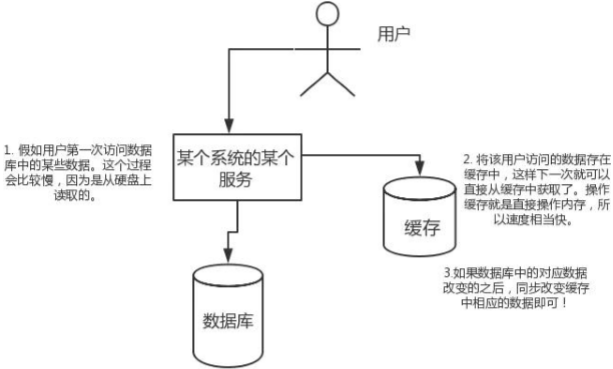 假如用户第一次访问数据库中的某些数据。这个过程会比较慢,因为是从硬盘上读取的。将该用户访问的数据存在数缓存中,这样下一次再访问这些数据的时候就可以直接从缓存中获取了。操作缓存就是直接操作内存,所以速度相当快。如果数据库中的对应数据改变的之后,同步改变缓存中相应的数据即可!