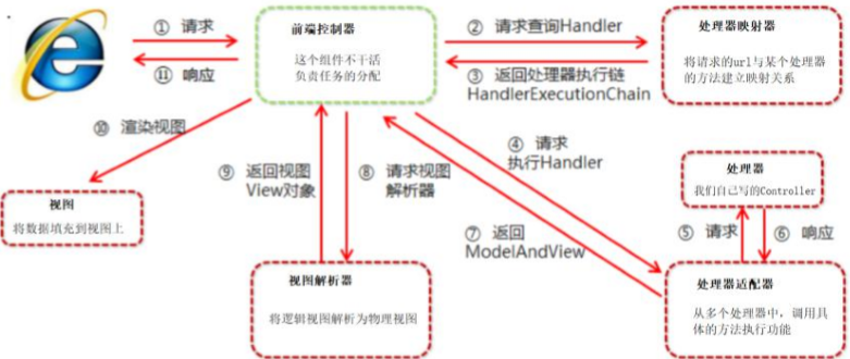 前端控制器DispatcherServlet:接收请求、响应结果,相当于转发器,有了 DispatcherServlet 就减少了其它组件之间的耦合度;