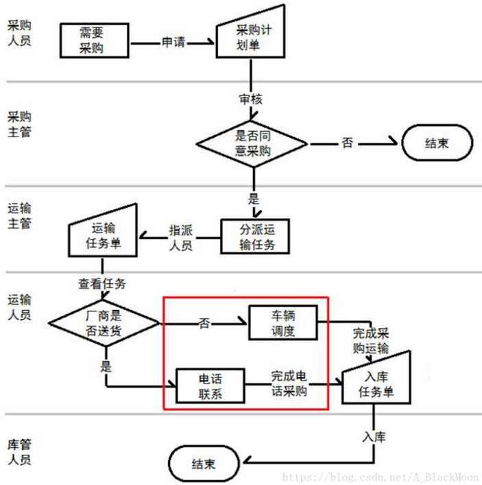 下采购单→采购审批→判定供应商是否送货→转入运输部门→运输任务指派→运输任务完成→按采购订单任务入库→流程结束。