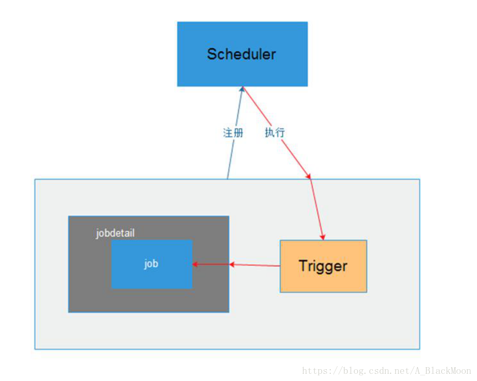 定时任务,job包一个jobdetail,再加上trigger,一起注册到调度器中,调度器先执行trigger, 再执行job,通过trigger触发了job,这是执行逻辑。