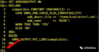 SET SERVEROUTPUT ON DECLARE compatible CONSTANT VARCHAR2(3) := CASE DBMS_PDB.CHECK_PLUG_COMPATIBILITY( pdb_descr_file => '/home/oracle/orcl.xml', pdb_name => 'NCDB') WHEN TRUE THEN 'YES' ELSE 'NO' END; BEGIN DBMS_OUTPUT.PUT_LINE(compatible); END; / |