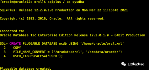 CREATE PLUGGABLE DATABASE ncdb USING '/home/oracle/orcl.xml' COPY FILE_NAME_CONVERT = ('/oradata/orcl', '/oradata/oracdb/') USER_TABLESPACES=('USERS'); |