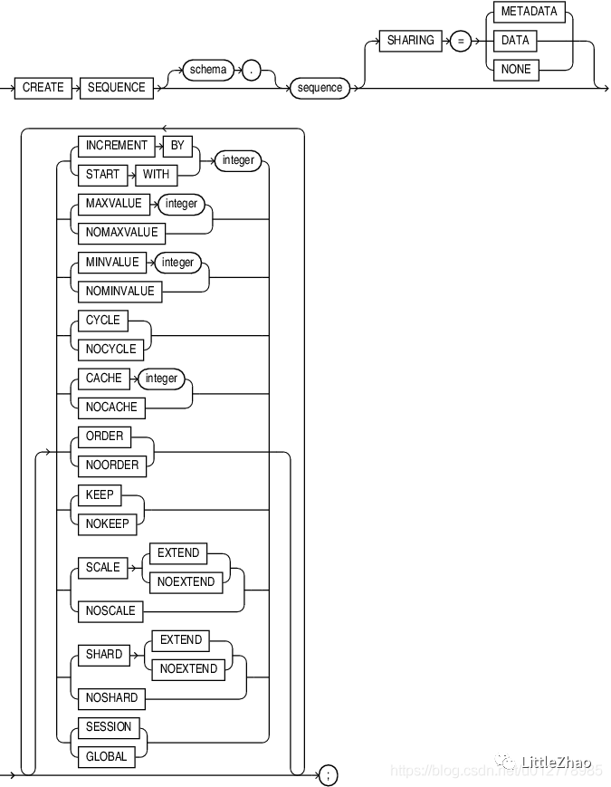 如果省略此子句,则数据库使用DEFAULT_SHARING初始化参数的值来确定序列的共享属性。如果DEFAULT_SHARING初始化参数没有值,则默认值为 METADATA。