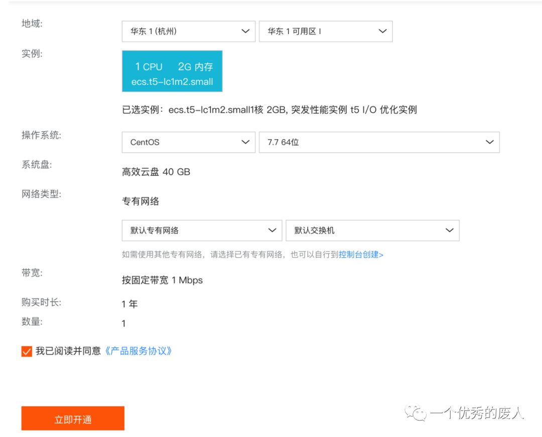 选择配置,地域选离你最近的地方,我选的深圳,系统选 centos (搞 java 一般是这个)、64 位、版本 7.7 。完事后立即开通。