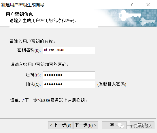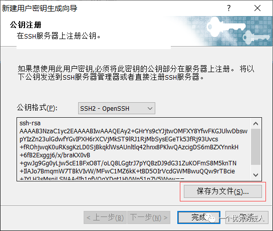 一直点下一步,生成了公钥,手动复制公钥之后,保存文件到你的电脑备用(选一个靠谱的路径存放,并记住,别弄得自己电脑目录乱七八糟的),最后点完成(这一步非常重要,记着点)。之后退出这个弹窗。