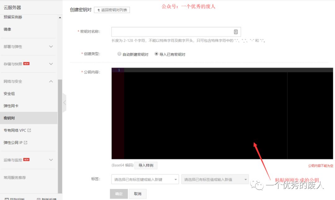 如下图,进到控制台,点击密钥对,创建密钥,输入密钥对名称(随便填),在黑框粘贴刚刚你复制的密钥,点确定。
