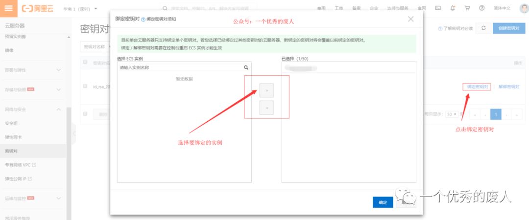 之后,如下图操作就行,点击绑定密钥对,选择你的实例,确定。
