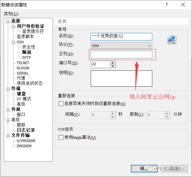 输入你的阿里云服务器公网 ip ,端口默认 22