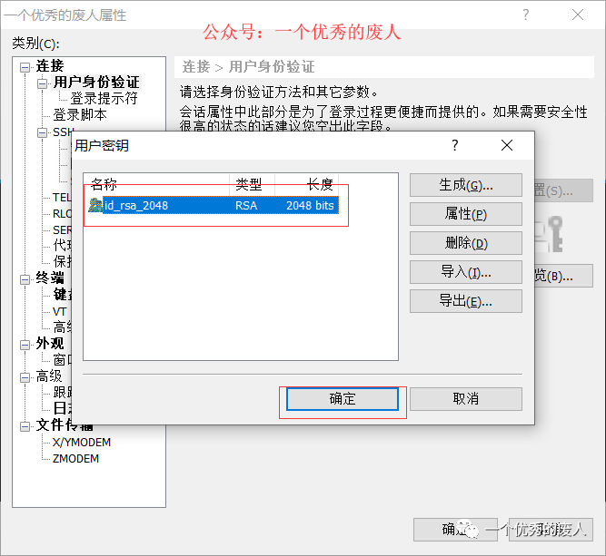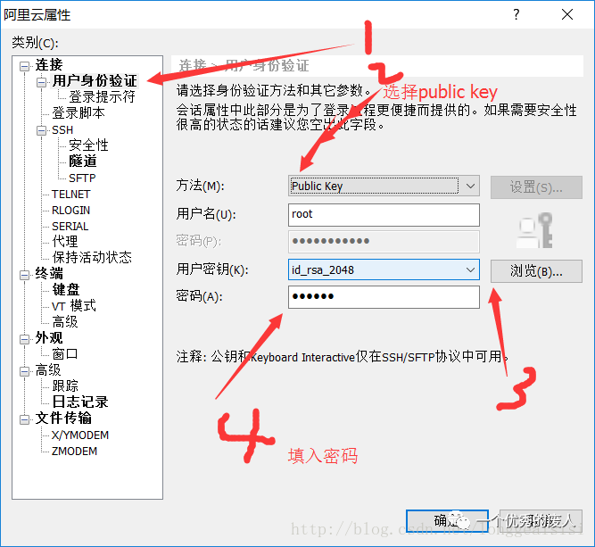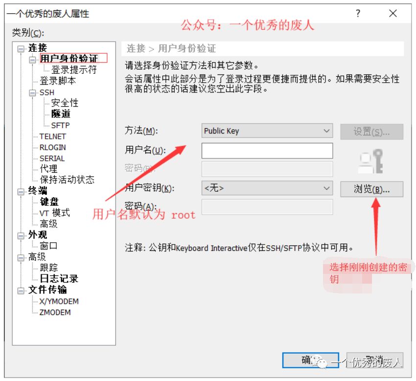 填写用户名,一般是 root ,点击浏览选择刚刚保存的密钥。