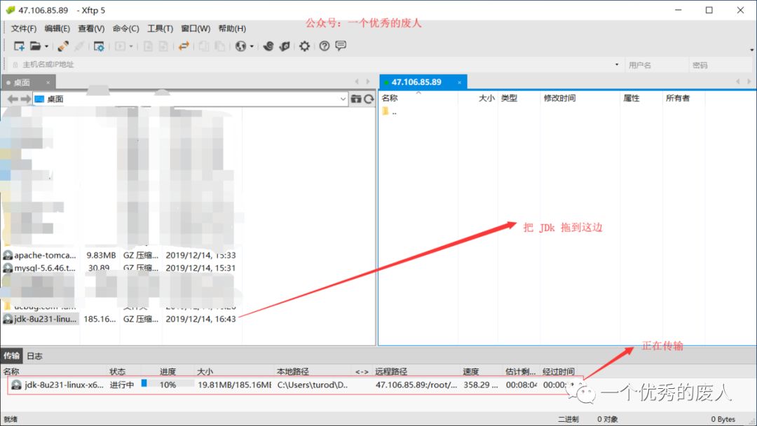 选择文件,这里以传输 JDK 为例(传输其他文件都一样),把 JDK8 安装包传输到 root/soft 目录下,如下图。
