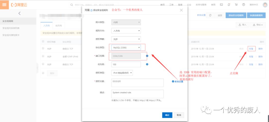 做到这里,如果你以为完事了,那只能说你真是 too young too naive 了。云服务器有安全机制,不是所有的端口都能随便访问,我们安装完 mysql 、tomcat 之后想访问,就必须要上云开网络安全组。为啥阿里要搞得这么麻烦?道理很简单,就是你家的门也不能随便让人想进就进的吧?
