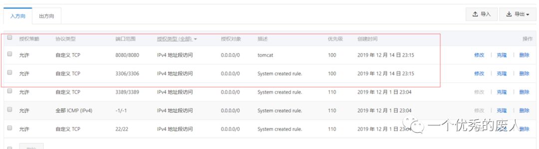 看到这里有人肯定会问了,为啥是入方向?这个方向是相对于服务器来说的,很容易理解,比如,我们从外面(比如我本地电脑)访问阿里云,那对阿里云来说就是有人要进来我家了,在比如,某一天我们需要从阿里云访问别人的服务器。比如,访问另一台服务器的 8080 端口,那对于我的服务器来说,我就要放通自己的出方向 8080 端口。对于别人服务器来说,就要放通入方向 8080 端口。