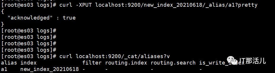 先给索引创建个别名: curl -XPUT localhost:9200/new_index_20210618/_alias/a1?pretty