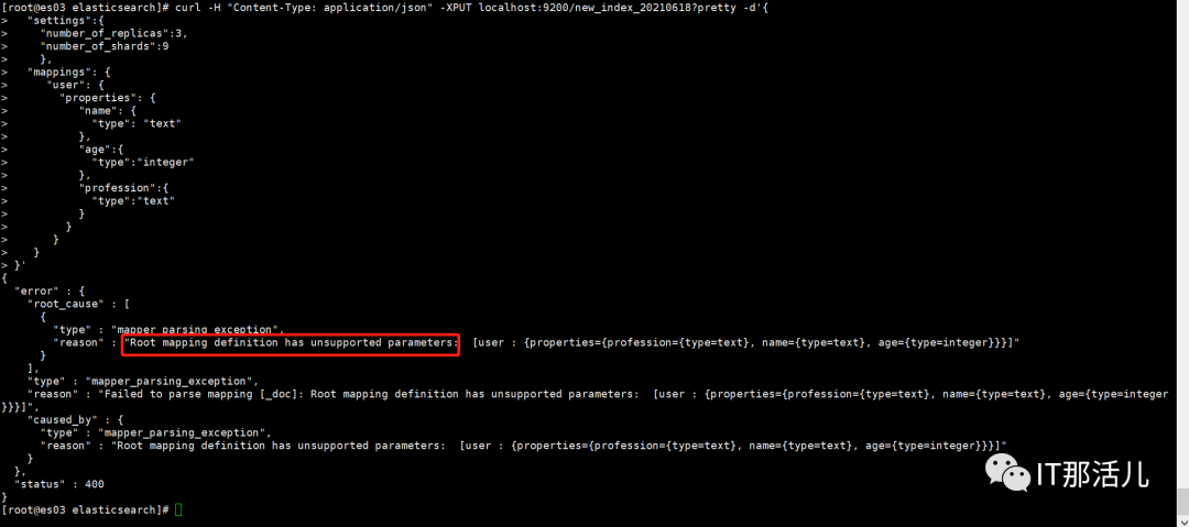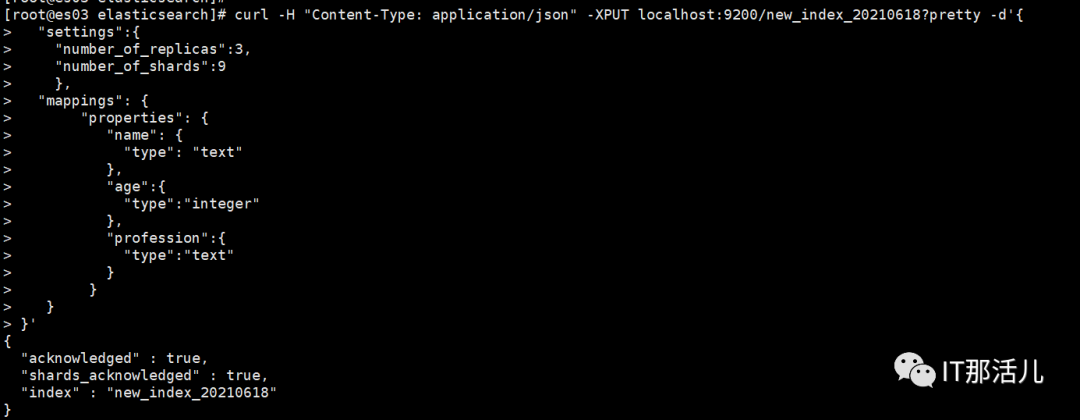 ▼▼▼curl -H"Content-Type: application/json" -XPUT localhost:9200/new_index_20210618?pretty -d'{ "settings":{ "number_of_replicas":3, "number_of_shards":9 }, "mappings": { "user": { "properties": { "name": { "type":"text" }, "age":{ "type":"integer" }, "profession":{ "type":"text" } } } }}'