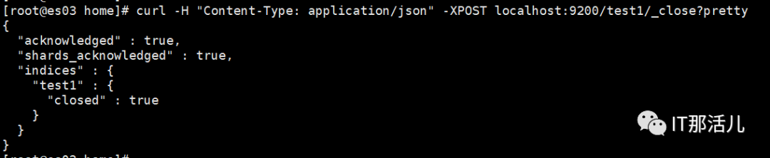 curl -H "Content-Type: application/json" -XPOST localhost:9200/test1/_close?pretty