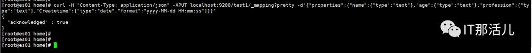 curl -H "Content-Type: application/json" -XPUT localhost:9200/test1/_mapping?pretty -d'{"properties":{"name":{"type":"text"},"age":{"type":"text"},"profession":{"type":"text"},"Createtime":{"type":"date","format":"yyyy-MM-dd HH:mm:ss"}}}'