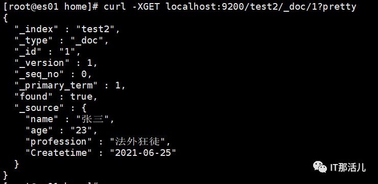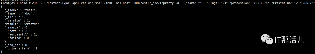 curl -H "Content-Type: application/json" -XPUT localhost:9200/test2/_doc/1?pretty -d '{"name":"张三","age":"23","profession":"法外狂徒","Createtime":"2021-06-25"}'