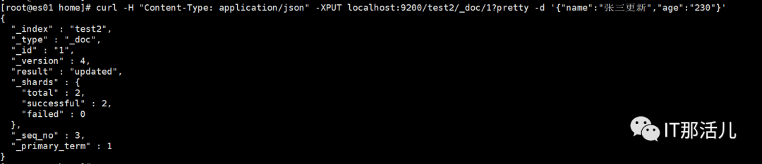 curl -H "Content-Type: application/json" -XPUT localhost:9200/test2/_doc/1?pretty -d '{"name":"张三更新","age":"230"}'