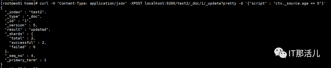 curl -H "Content-Type: application/json" -XPOST localhost:9200/test2/_doc/1/_update?pretty -d '{"script" : "ctx._source.age += 5"}'