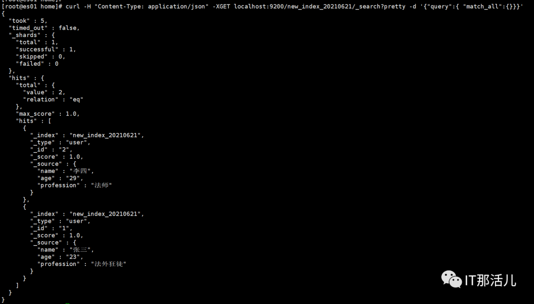 curl -H "Content-Type: application/json" -XGET localhost:9200/new_index_20210621/_search?pretty -d '{"query":{ "match_all":{}}}'