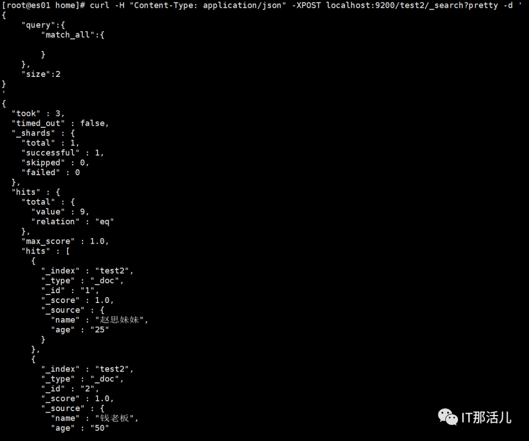 ▼▼▼curl -H "Content-Type: application/json" -XPOST localhost:9200/test2/_search?pretty -d '{ "query":{ "match_all":{ } }, "_source":[ "name", "age" ], "size":2}'