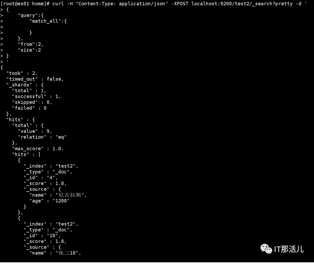 ▼▼▼curl -H "Content-Type: application/json" -XPOST localhost:9200/test2/_search?pretty -d '{ "query":{ "match_all":{ } }, "from":2, "size":2}'