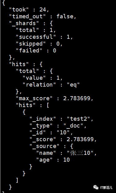▼▼▼curl -H "Content-Type: application/json" -XPOST localhost:9200/test2/_search?pretty -d '{ "query":{ "match":{ "age":10 } }}'