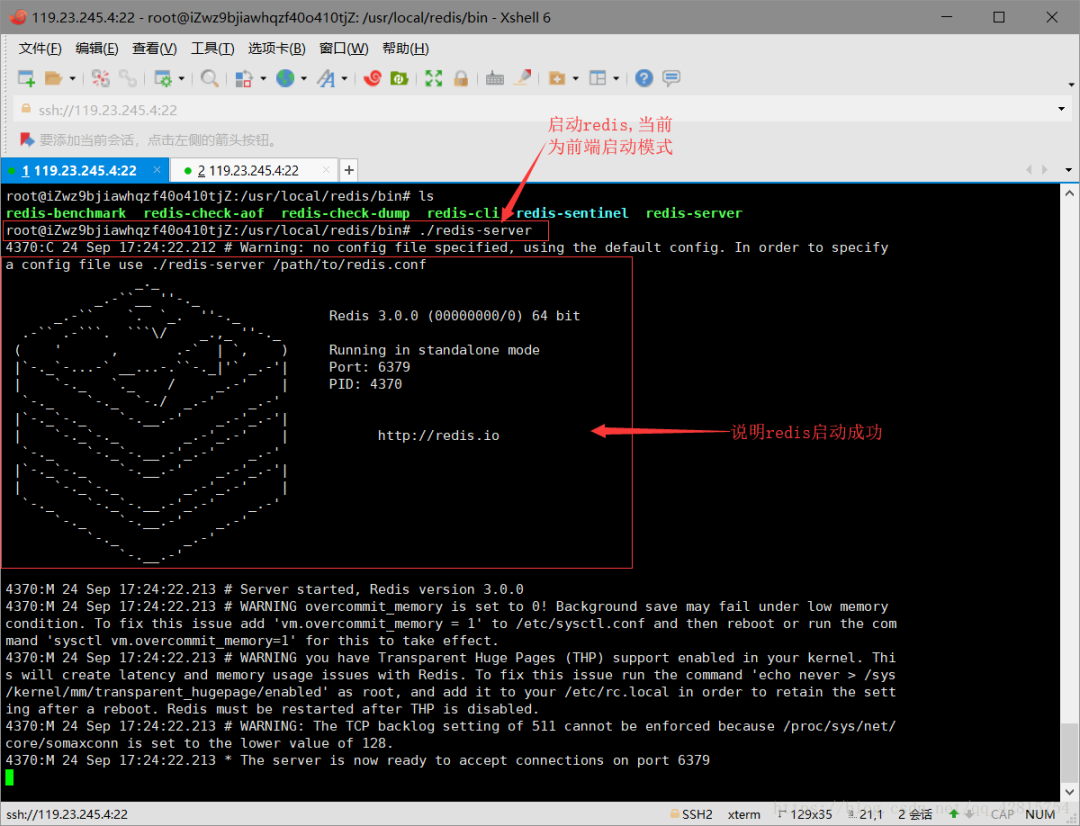 2.9 至此,可以启动redis了,默认启动模式为前端启动,指令如下