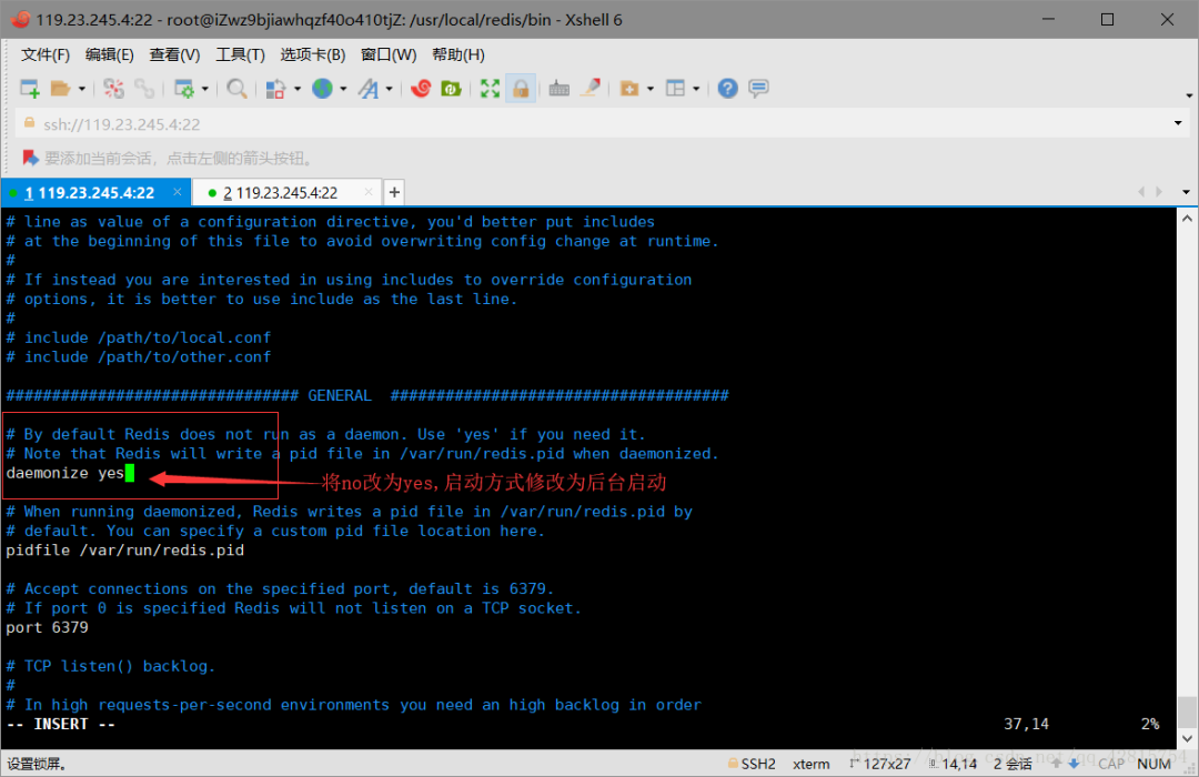 第二步:修改redis.conf文件,将daemonize no -> daemonize yes,这样便将启动方式修改为后台启动了