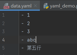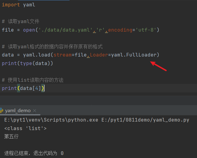 import yaml# 读取yaml文件file = open('./data/data.yaml','r',encoding='utf-8')# 读取yaml格式的数据内容并保存原有的格式data = yaml.load(stream=file,Loader=yaml.FullLoader)print(type(data))# 使用list读取内容的方法print(data[4])