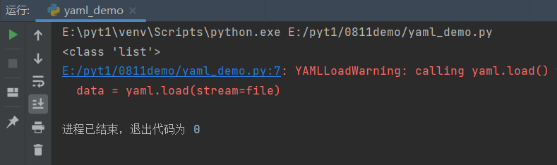 可以看到读取的数据类型是list 以及有个Warning: calling yaml.load() without Loader=... is deprecated, as the default Loader is unsafe 解决办法:加上Loader=yaml.FullLoader