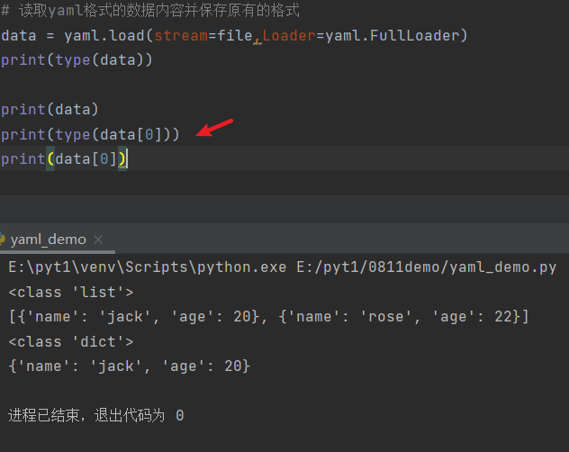 import yaml# 读取yaml文件file = open('./data/dict_data.yaml','r',encoding='utf-8')# 读取yaml格式的数据内容并保存原有的格式data = yaml.load(stream=file,Loader=yaml.FullLoader)print(type(data))print(data)print(type(data[0]))print(data[0])