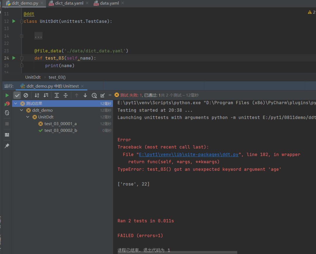 提示无法识别age 原因是因为ddt返回来的数据类型是字典,所以函数形参也要对应改变 解决方式:def test_03(self,**kwargs)