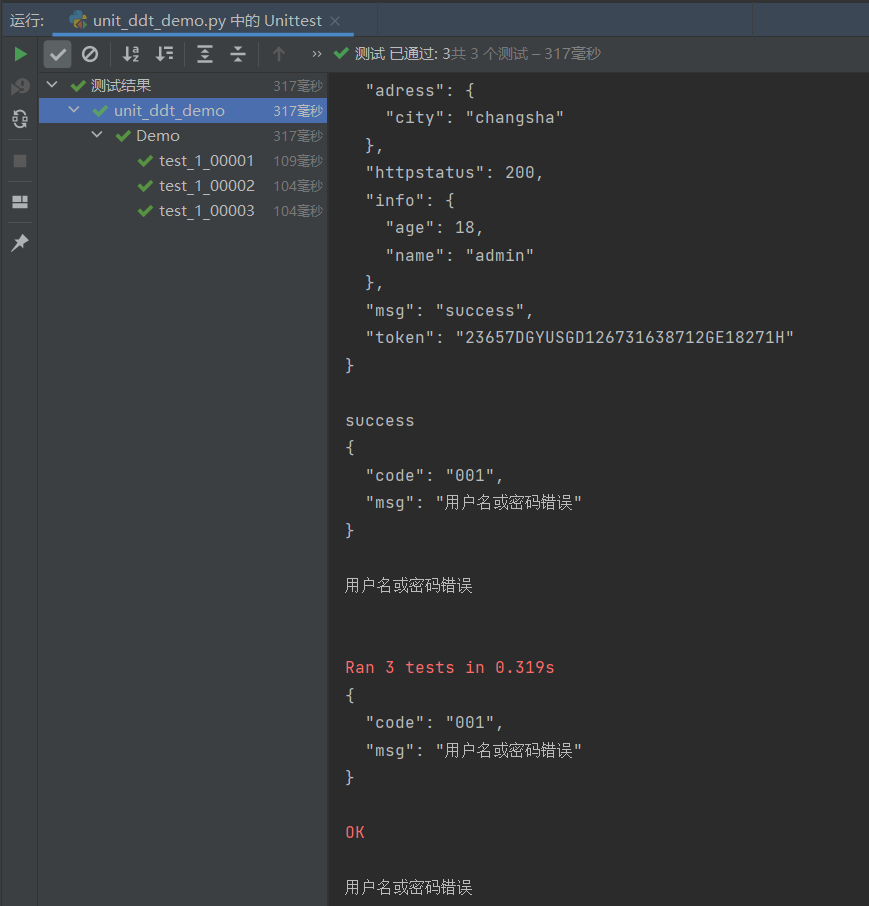 import jsonimport unittestimport requestsimport jsonpathfrom ddt import ddt,file_data@ddtclass Demo(unittest.TestCase):@file_data('./data/user.yaml')def test_1(self, user, msg):url = 'http://39.98.138.157:5000/api/login'data = {'username': user['username'],'password': user['password']}res = requests.post(url=url, json=data)print(res.text)# 基于jsonpath提取响应结果msgres_json = json.loads(res.text)msg_result = jsonpath.jsonpath(res_json,'$..msg')print(msg_result[0])# 通过获取的结果与yaml文件msg比对断言校验self.assertEqual(msg_result[0],msg)if __name__ == '__main__':unittest.main()