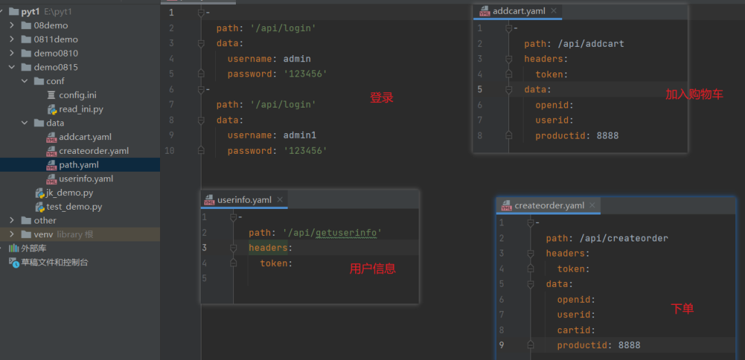 接口测试的操作步骤 准备数据 发送请求 判断响应 根据测试步骤,将数据和请求相分离 数据都放在/data目录下,一条测试用例一个yaml文件,方便维护与管理 常用操作的封装