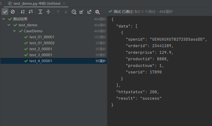 import unittestimport requestsfrom demo0815.conf import read_inifrom ddt import ddt,file_datafrom demo0810.api_key import Apikey@ddtclass CaseDemo(unittest.TestCase):@classmethoddef setUpClass(cls) -> None:cls.url = read_ini.read_ini('./conf/config.ini','TEST_SERVER','url')cls.ak = Apikey()cls.token = Nonecls.userid = Nonecls.openid = Nonecls.cartid = None# login接口的测试用例@file_data('./data/path.yaml')def test_01(self,path,data):url = self.url + pathres = self.ak.do_post(url=url,json=data)print(res.text)# 赋值全部变量,类名.变量token = self.ak.get_text(res.text,'token')if token:CaseDemo.token = tokenprint(CaseDemo.token)# userinfo接口的测试用例@file_data('./data/userinfo.yaml')def test_2(self,path,headers):url = self.url + pathheaders['token'] = CaseDemo.tokenres = self.ak.do_get(url=url,headers=headers)print(res.text)# 获取userid,useriduserid = self.ak.get_text(res.text,'userid')openid = self.ak.get_text(res.text, 'openid')if userid:CaseDemo.userid = useridif openid:CaseDemo.openid = openid@file_data('./data/addcart.yaml')# addcart 添加商品到购物车,基于token,userid,openiddef test_3(self,path,headers,data):url = self.url + pathheaders['token'] = CaseDemo.tokendata['userid'] = CaseDemo.useriddata['openid'] = CaseDemo.openidres = self.ak.do_post(url=url, headers=headers,json=data)print(res.text)# 获取cartidcartid = self.ak.get_text(res.text, 'cartid')if cartid:CaseDemo.cartid = cartid@file_data('./data/createorder.yaml')# createorder 购物车下单def test_4(self,path,headers,data):url = self.url + pathheaders['token'] = CaseDemo.tokendata['userid'] = CaseDemo.useriddata['openid'] = CaseDemo.openiddata['cartid'] = CaseDemo.cartidres = self.ak.do_post(url=url, headers=headers, json=data)print(res.text)if __name__ == '__mian__':unittest.main()
