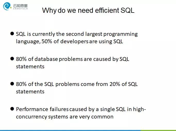 根据经验80%的数据库问题是由于SQL引起的,而80%的SQL问题来自于20%的SQL语句,在一些高并发高负载的系统中,由于一条SQL的性能问题导致数据库整体出现异常的情况屡见不鲜,这也是杨廷琨本次选择这个主题的原因,希望帮助更多的开发人员可以书写出高效的SQL语句。