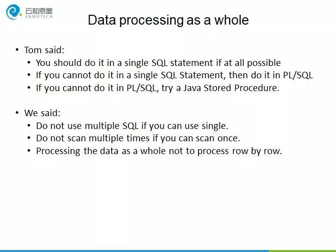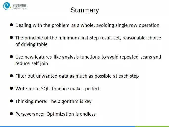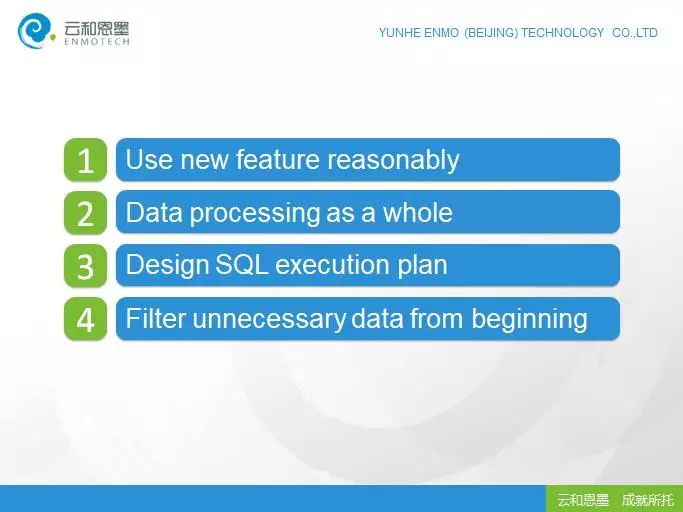 本次主题包括四方面的内容:合理的使用新特性;数据集整体处理;设计SQL执行计划;严格过滤数据。