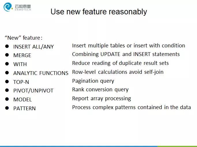 合理的使用新特性,可以避免重复访问数据,合并简化执行操作过程,缓存中执行间结果,减少自关联,高效灵活的处理一些复杂问题。因此,充分理解新特性的功能以及其适用场景,是书写高效SQL语句的基础。