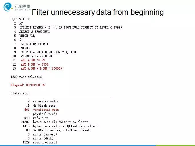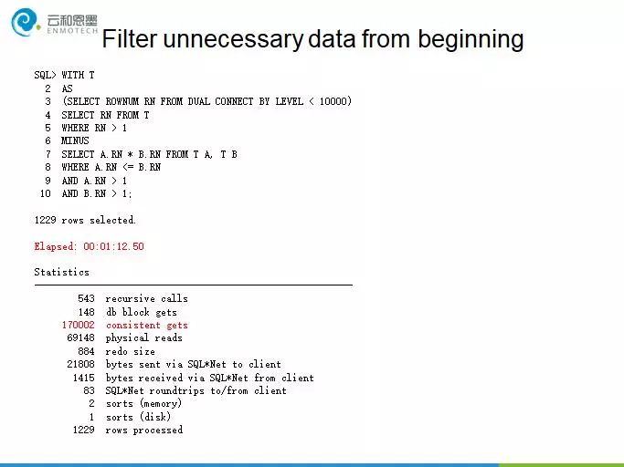 过滤不必要的数据对于提升SQL的性能非常重要,对于一个计算10000以内质数的SQL,未经优化前需要1分12秒的执行时间,消耗17万逻辑读。