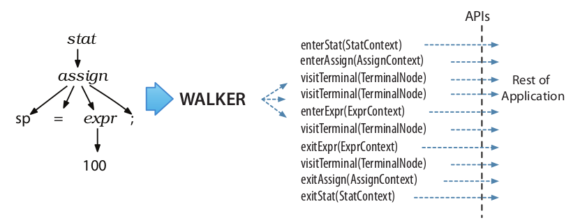 ANTLRInputStream input = new ANTLRInputStream(is);LabeledExprLexer lexer = new LabeledExprLexer(input);CommonTokenStream tokens = new CommonTokenStream(lexer);LabeledExprParser parser = new LabeledExprParser(tokens);ParseTree tree = parser.prog(); // parseParseTreeWalker walker = new ParseTreeWalker();walker.walk(new EvalListener(), tree);