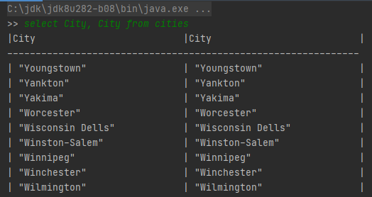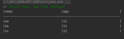 /*** 获取待查询的表名和字段名称*/QuerySpecification specification = (QuerySpecification) query.getQueryBody();Table table= (Table) specification.getFrom().get();List<SelectItem> selectItems = specification.getSelect().getSelectItems();List<String> fieldNames = Lists.newArrayList();for(SelectItem item:selectItems){SingleColumn column = (SingleColumn) item;fieldNames.add(((Identifier)column.getExpression()).getValue());}/*** 基于表名确定查询的数据源文件*/String fileLoc = String.format("./data/%s.csv",table.getName());/*** 从csv文件中读取指定的字段*/Reader in = new FileReader(fileLoc);Iterable<CSVRecord> records = CSVFormat.RFC4180.withFirstRecordAsHeader().parse(in);List<Row> rowList = Lists.newArrayList();for(CSVRecord record:records){Row row = new Row();for(String field:fieldNames){row.addColumn(record.get(field));}rowList.add(row);}/*** 格式化输出到控制台*/int width=30;String format = fieldNames.stream().map(s-> "%-"+width+"s").collect(Collectors.joining("|"));System.out.println( "|"+String.format(format, fieldNames.toArray())+"|");int flagCnt = width*fieldNames.size()+fieldNames.size();String rowDelimiter = String.join("", Collections.nCopies(flagCnt, "-"));System.out.println(rowDelimiter);for(Row row:rowList){System.out.println( "|"+String.format(format, row.getColumnList().toArray())+"|");}