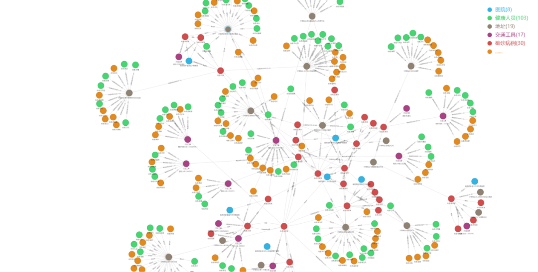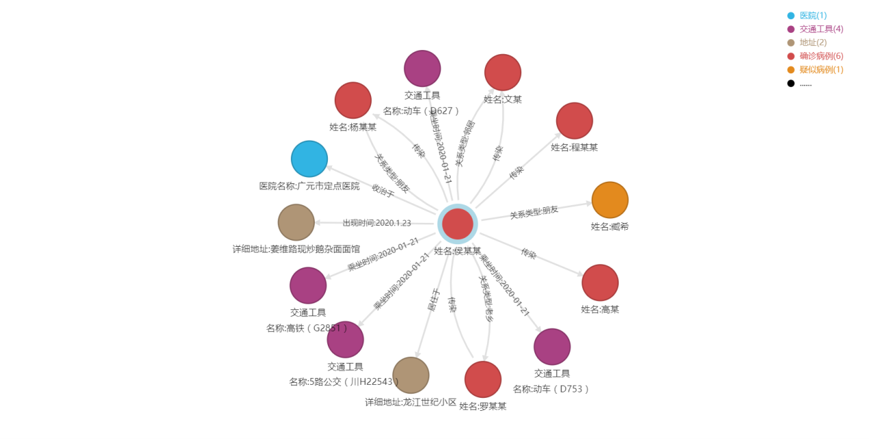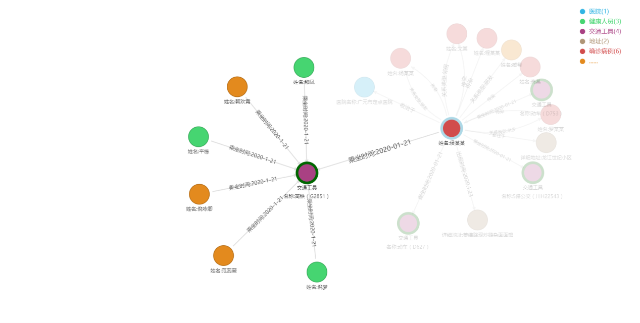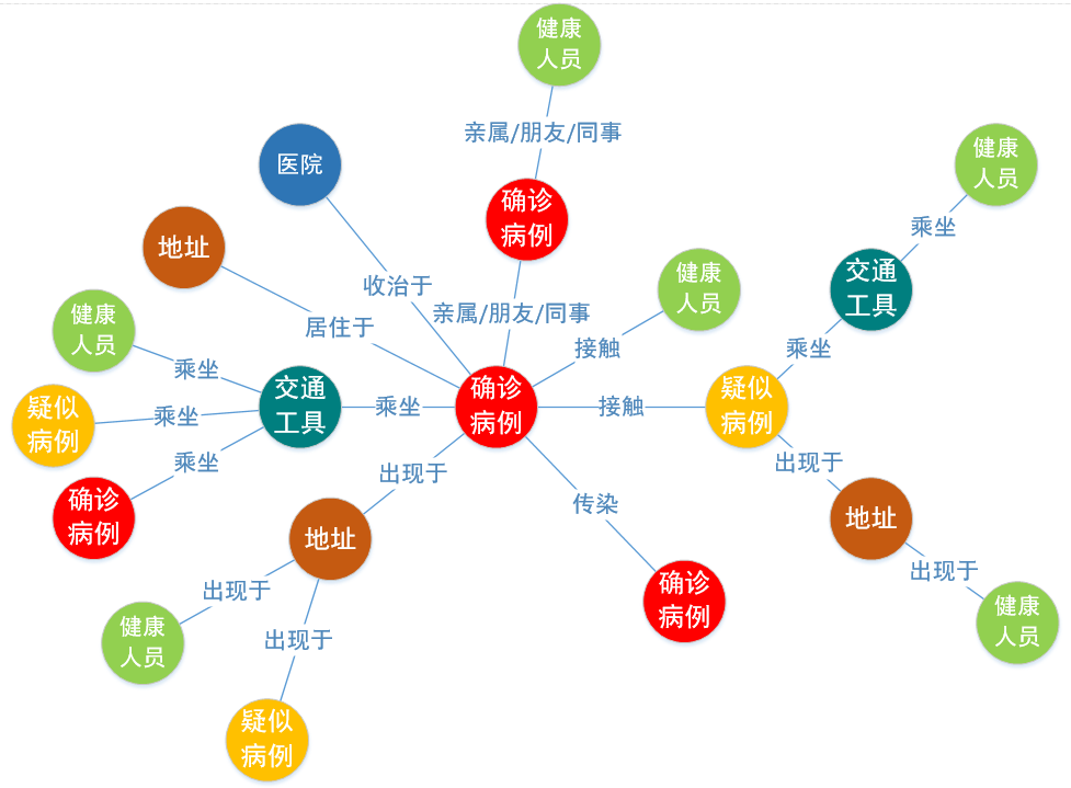 1、首先进行数据建模,主要分为健康人员、确诊病例、疑似病例、地址、交通工具、医院等实体数据,以及各实体之间的关联关系,如人员“乘坐”某交通工具,建模效果如图1所示。