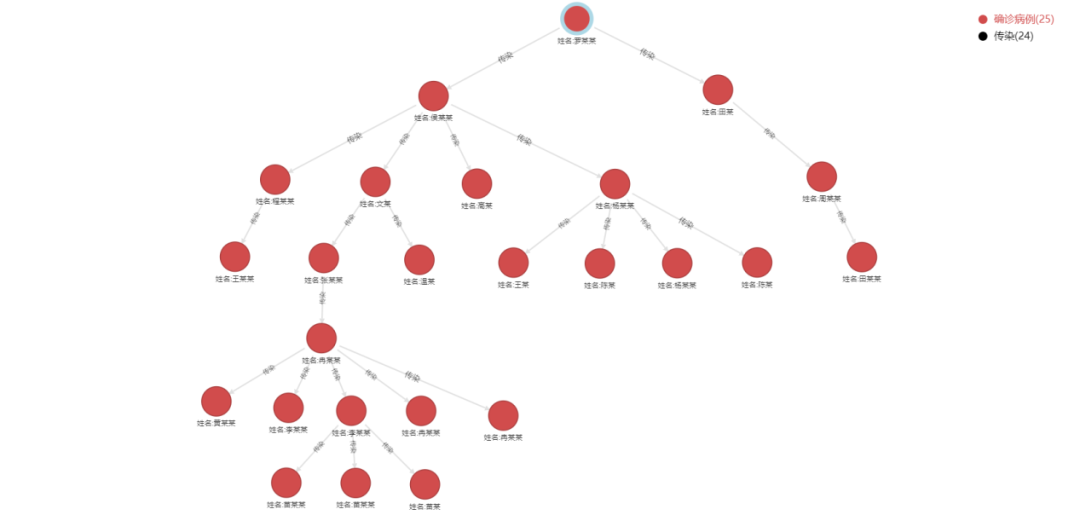 4、GDM的关系是有向的,这就表示可以通过有向的关系分析,来找出错综关系中的源头数据,例如疫情肆虐,我们期望找出0号病人,以分析出病毒的最终源头。探索主体类型为“确诊患者”,筛选某个确诊患者,设置关联类型为“传染”,对其持续进行有向的关系探索,直到确定最终的传染源。
